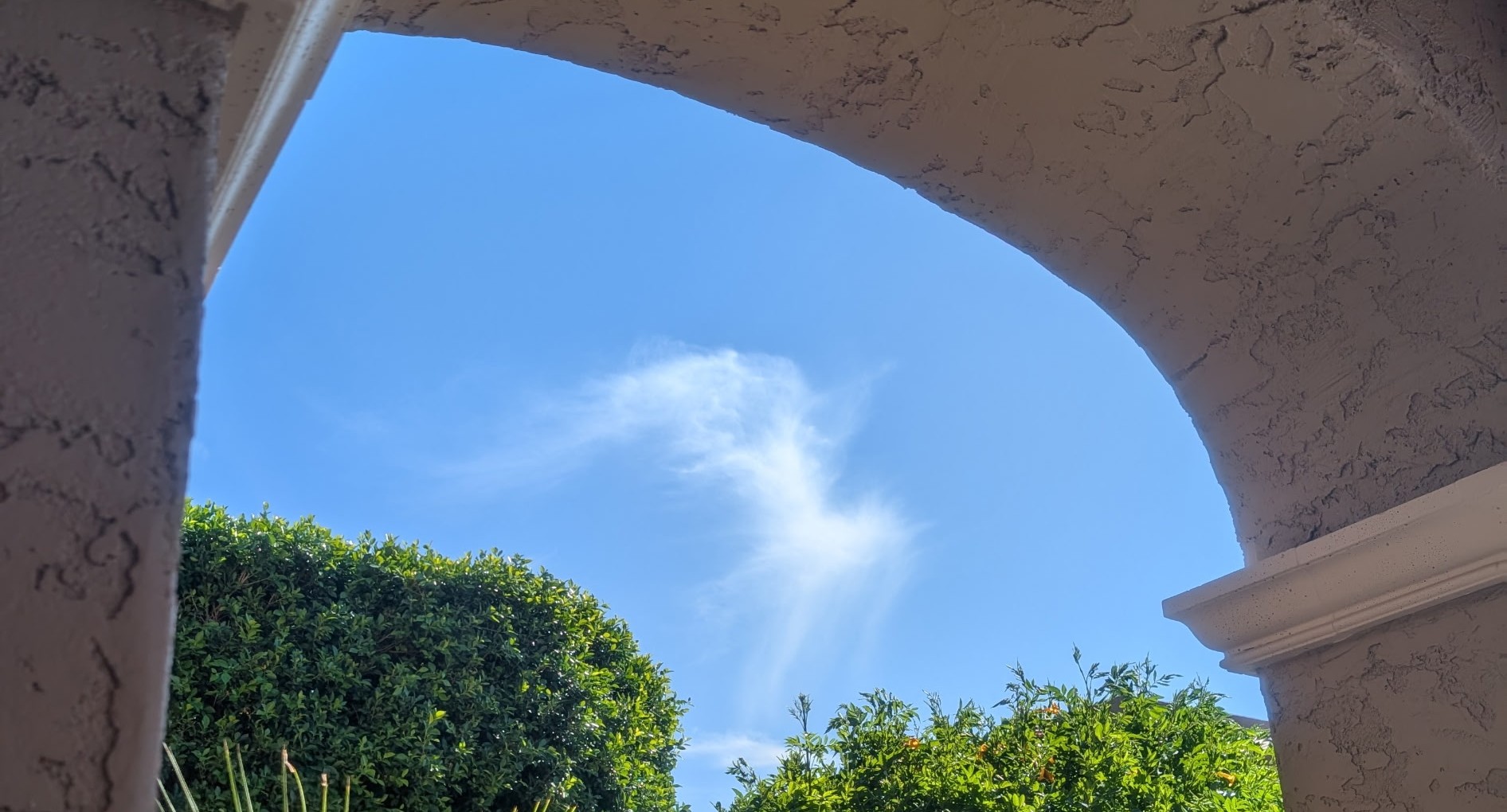 As I sat and visited with my brother Bruce, father of the groom, I noticed a cloud in the shape of a Phoenix, over his shoulder. It stretched out in a forward, mounting motion, as if reaching for the next adventure. The archway behind my sibling framed the cloud for the photo I took.